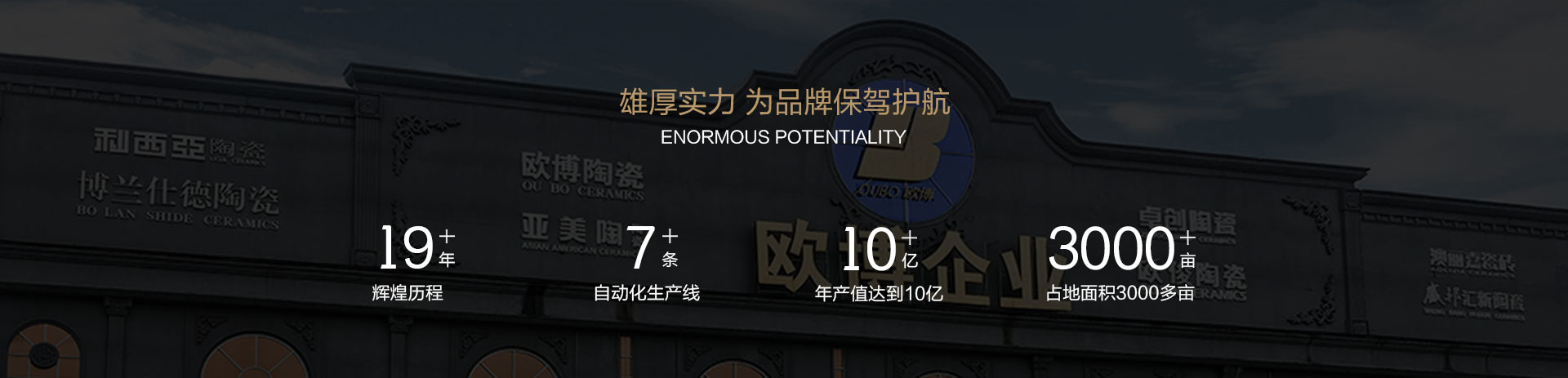 佛山市欧博瓷业有限公司创立于2003年,有着20年专注瓷砖生产历史。总部位于中国陶都 ----- 广东省佛山市南庄紫洞工业开发区。公司有着多年技术开发,资讯交流等经验,为欧博企业提供了优秀的起点平台。 欧博陶瓷在规模量化的基础上,严格遵循 ISO9001 : 2015 国际质量体系管理,产品各项物理指标均达到国家及国际相关标准,符合 GB/T4100-2015 标准和 GB6566-2010 《建筑材料放射性核素限量》标准 A 类装饰材料要求。 公司具有7条智能自动化生产线。专业生产 400*800mm 、 800*800mm 、600*1200mm 、 750*1500mm、900*1800mm 等标准规格产品,产品涵盖抛光砖、通体中板、柔光大理石、无界耐磨石、天鹅绒质感系列、岩板大板等系列产品,并可依据客户实际需求定制,能为各类工程项目、专业设计师以及普通家庭用户,提供丰富选择。 超越首先源于自身的提高,欧博陶瓷所推崇的发展之道,是致力于创新与人本的进步哲学,共赢是我们公共的追求!